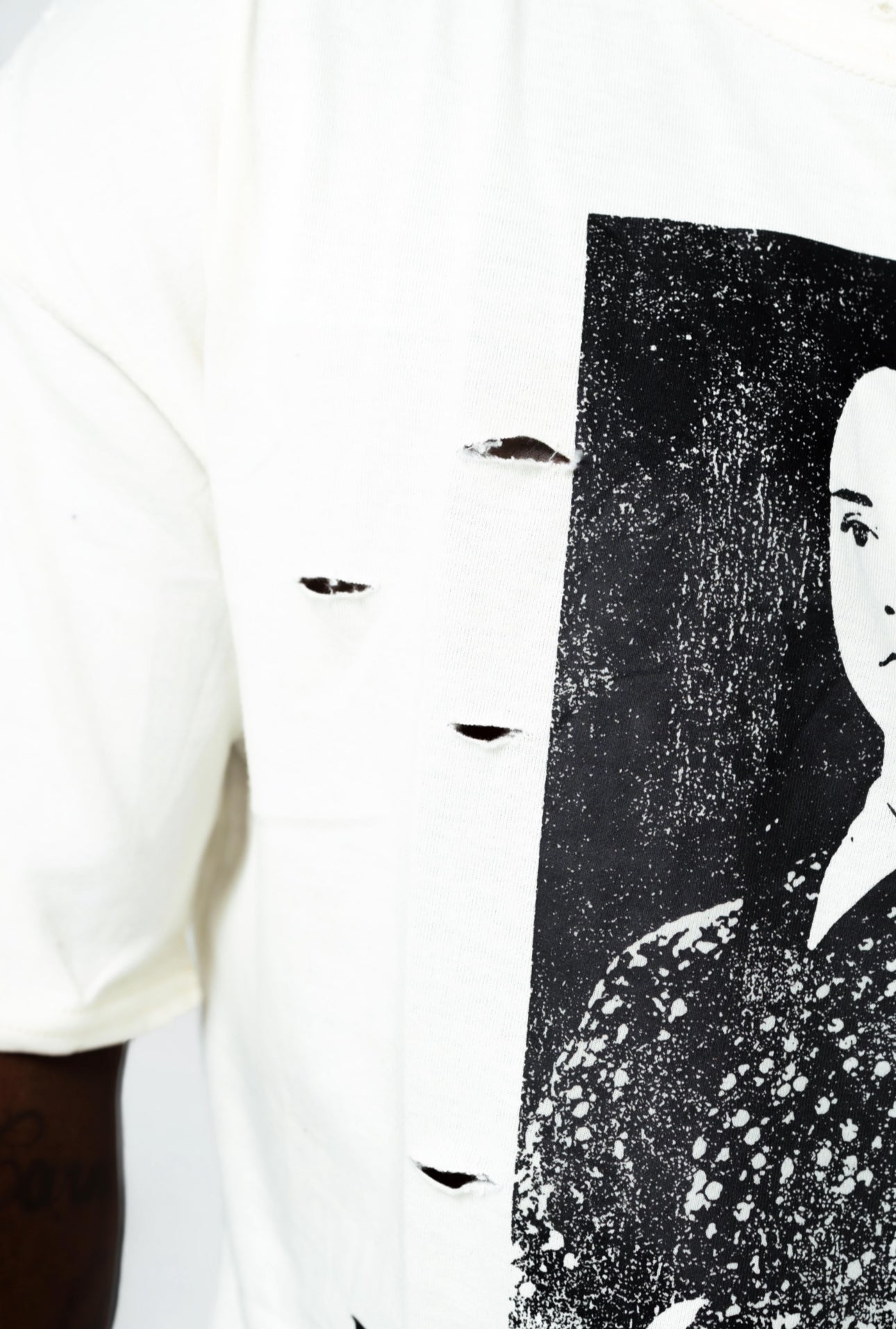 Details: Rib knit neckline, single stitch hem, distressed throughout